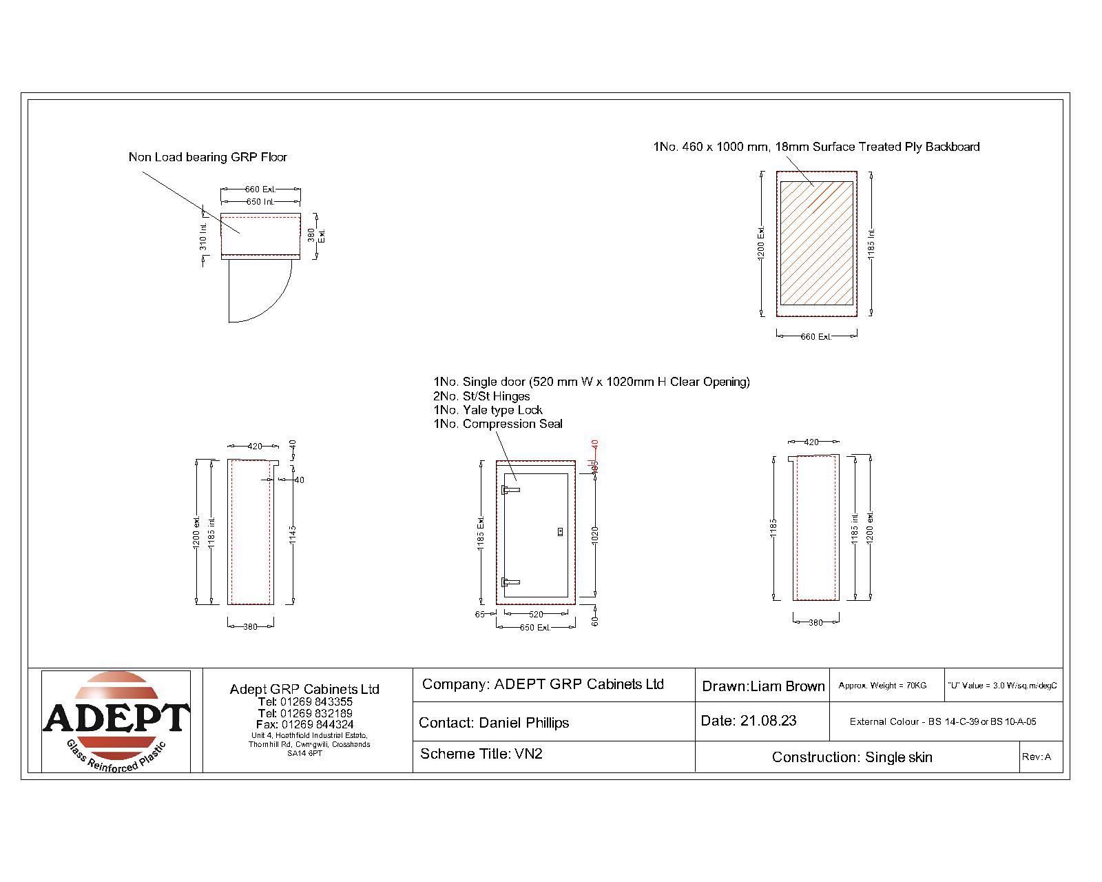 Our VN2 GRP Cabinet is available in Green (BS 14-C-39) and Grey (BS 10-A-05) as standard and is finished internally with a fire-retardant resin, it has a Single Skin Construction and comes complete with stainless steel hinges, security fixings, a cylinder nightlatch lock as well as a surface treated ply backboard. Delivery is normally made by National Carrier.