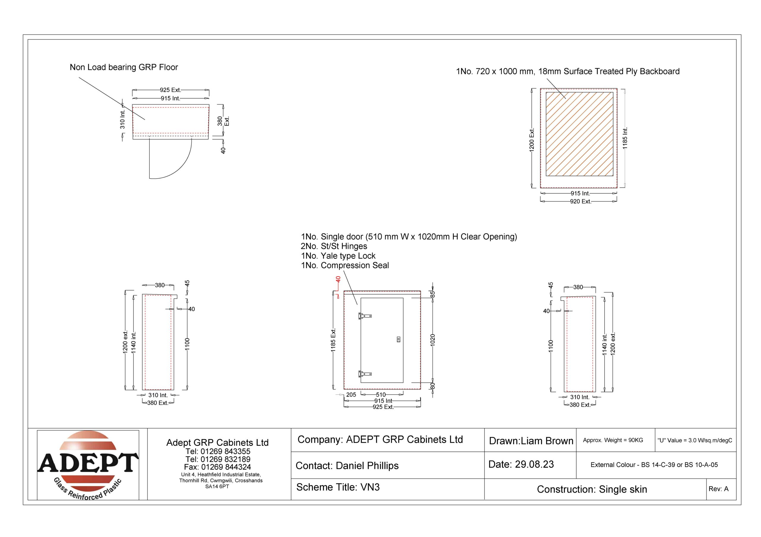 Our VN3 GRP Cabinet is available in Green (BS 14-C-39) and Grey (BS 10-A-05) as standard and is finished internally with a fire-retardant resin, it has a Single Skin Construction and comes complete with stainless steel hinges, security fixings, a cylinder nightlatch lock as well as a surface treated ply backboard. Delivery is normally made by National Carrier.