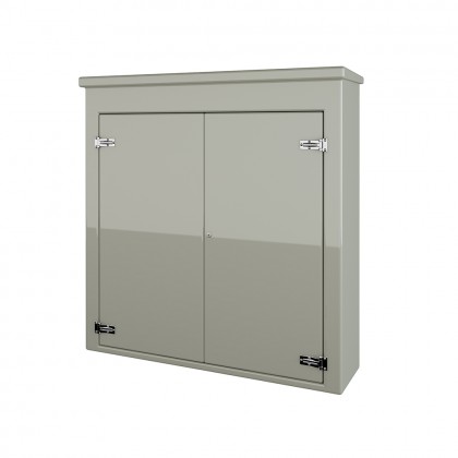 Our VR13-E GRP Enclosure is available in Green (BS 14-C-39) and Grey (BS 10-A-05) as standard and is finished internally with a fire-retardant resin, it has a 12mm ply core encapsulated within the construction and comes complete with stainless steel hinges, security fixings, a cylinder nightlatch lock, hold open door stays and a surface treated ply backboard, it has an open base c/w an internal fixing down flange for floor mounting.