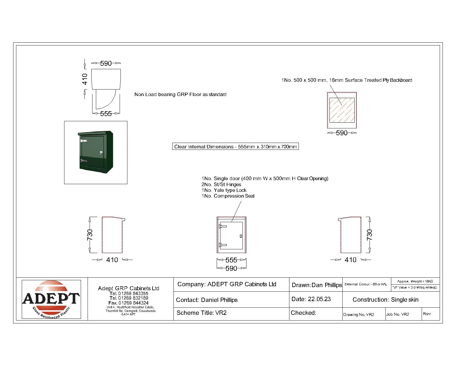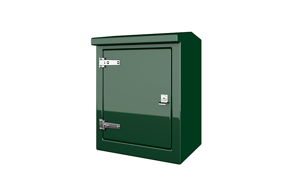 Our VR2 GRP Cabinet is available in Green (BS 14-C-39) and Grey (BS 10-A-05) as standard and is finished internally with a fire-retardant resin, it has a Single Skin Construction and comes complete with stainless steel hinges, security fixings, a cylinder nightlatch lock as well as a surface treated ply backboard, it has a closed base and is suitable for both floor or wall mounting. Delivery is normally made by National Carrier.