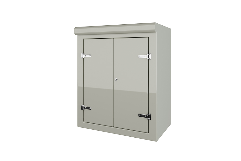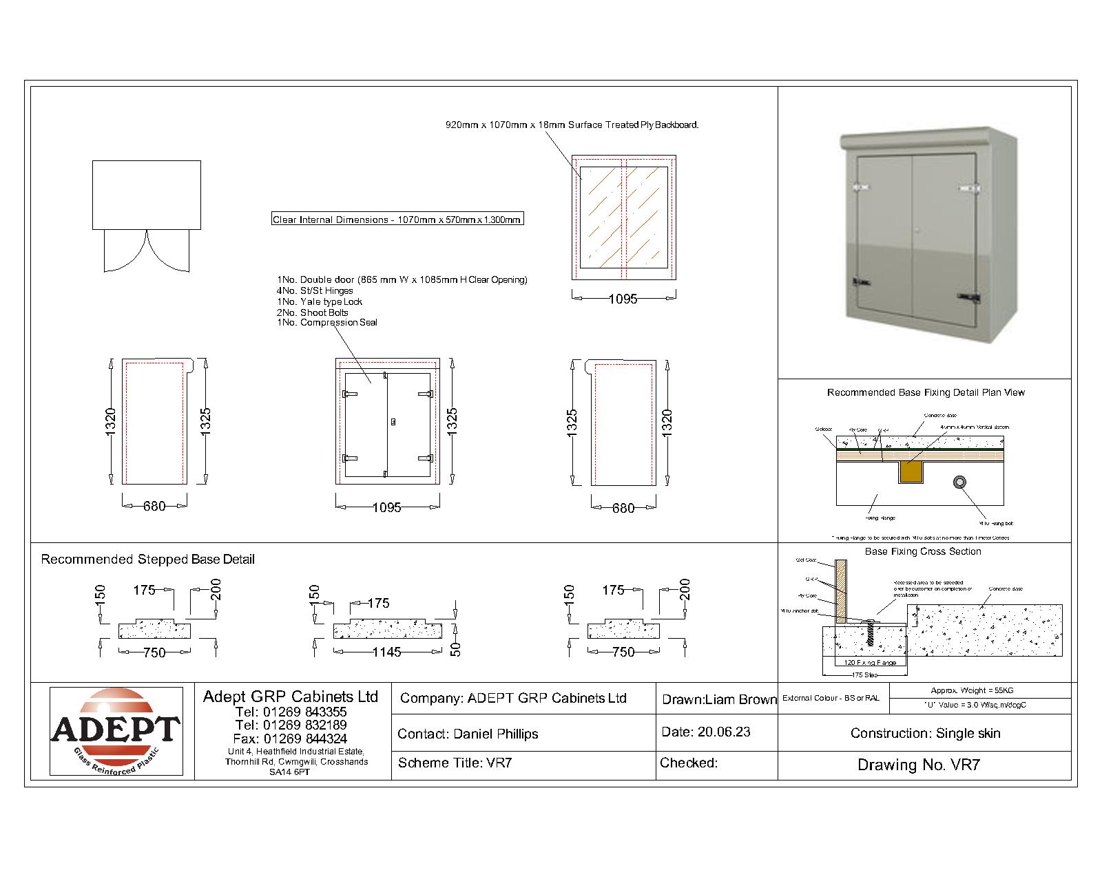 Our VR7 GRP Cabinet is available in Green (BS 14-C-39) and Grey (BS 10-A-05) as standard and is finished internally with a fire-retardant resin, it has a Single Skin Construction and comes complete with stainless steel hinges, security fixings, a cylinder nightlatch lock as well as a surface treated ply backboard, it has an open base c/w an internal fixing down flange for floor mounting. Delivery is normally made by National Carrier.
