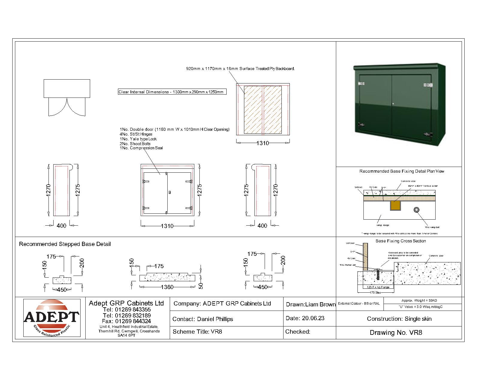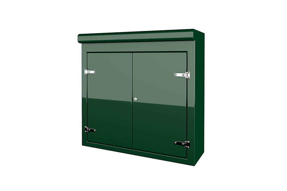 Our VR8 GRP Cabinet is available in Green (BS 14-C-39) and Grey (BS 10-A-05) as standard and is finished internally with a fire-retardant resin, it has a Single Skin Construction and comes complete with stainless steel hinges, security fixings, a cylinder nightlatch lock as well as a surface treated ply backboard, it has an open base c/w an internal fixing down flange for floor mounting. Delivery is normally made by National Carrier.