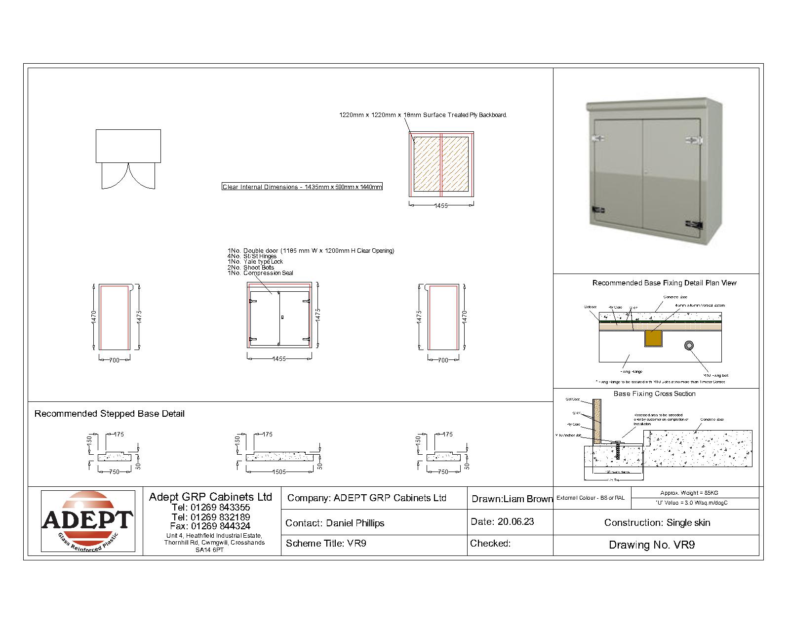 Our VR9 GRP Cabinet is available in Green (BS 14-C-39) and Grey (BS 10-A-05) as standard and is finished internally with a fire-retardant resin, it has a Single Skin Construction and comes complete with stainless steel hinges, security fixings, a cylinder nightlatch lock as well as a surface treated ply backboard, it has an open base c/w an internal fixing down flange for floor mounting. Delivery is normally made by National Carrier.