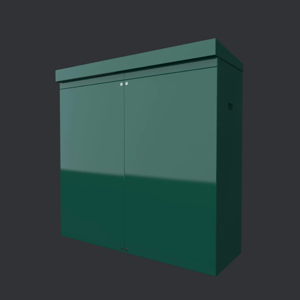 The standard finish is a high quality texture in dark green (RAL 6005). All kiosks are fitted with lifting brackets, 14mm floor fixings, hold open door stays, night-latch lock, 7mm triangular key locks, a surface treated ply backboard and earthing points as standard.